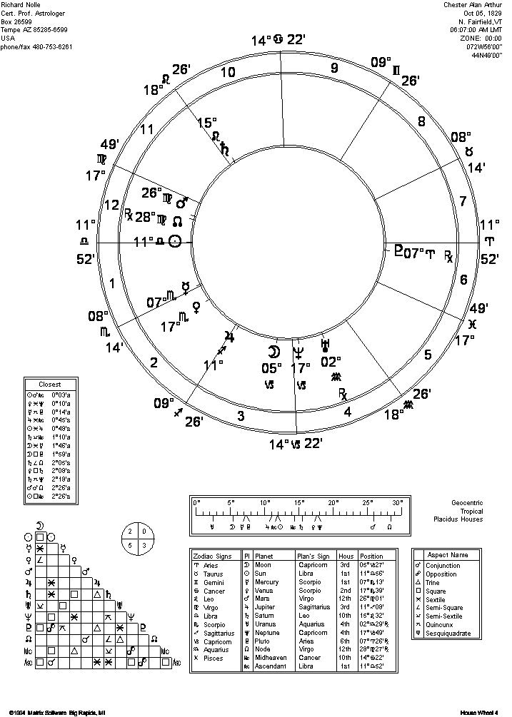 - US President #21 CHESTER ALAN ARTHUR (OCT 05, 1829, 06:07:00 AM LMT, 00:00, 072W56, 44N49, N. Fairfield, VT)9