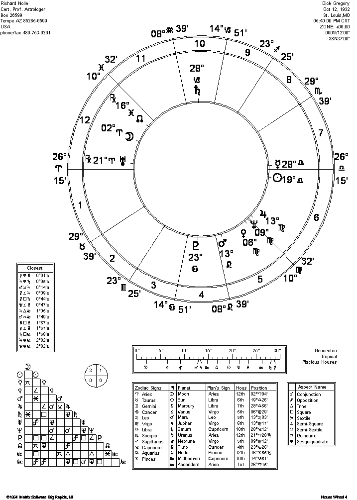 - comedian/social activist DICK GREGORY (OCT 12, 1932, 05:40:00 PM CST, +06:00, 090W12, 38N37, St. Louis, MO)24