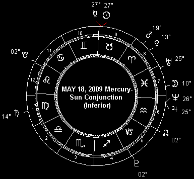 May marks the first month this year without any major Mars activations other than a carry-over of the April 26 Mars-Pluto square that hangs on through the first few days of the month. Humans being humans, this hardly means the lion will lay down with the lamb. But the most heinous criminality, the biggest military clashes, the worst terrorist attacks I know, I repeat myself these should ease somewhat in comparison to the first trimester of 2009. Accidents there will be aplenty however, so its not as if we can let down our guard completely. Accidental fires, crashes, explosions and the like are far from rare during the kind of Mercury intersolar cycle that holds sway throughout May (including the May 7-31 retrograde and the May 18 inferior conjunction with the Sun); and on into June, coming to an end at last on June 13, when Mercury reaches its greatest elongation west of the Sun.